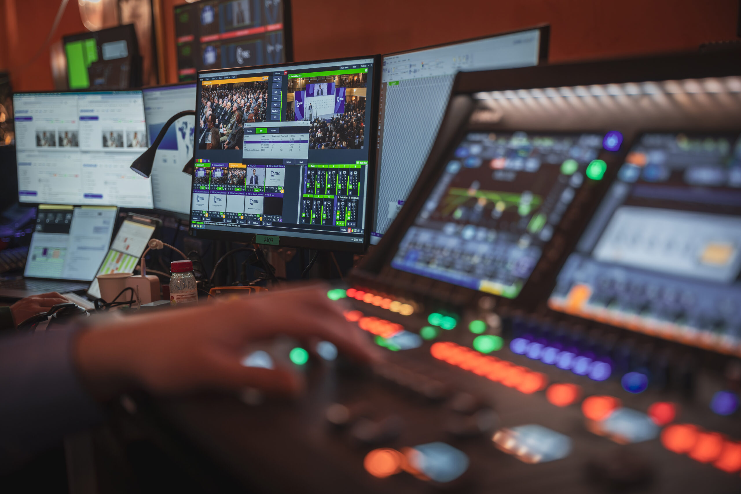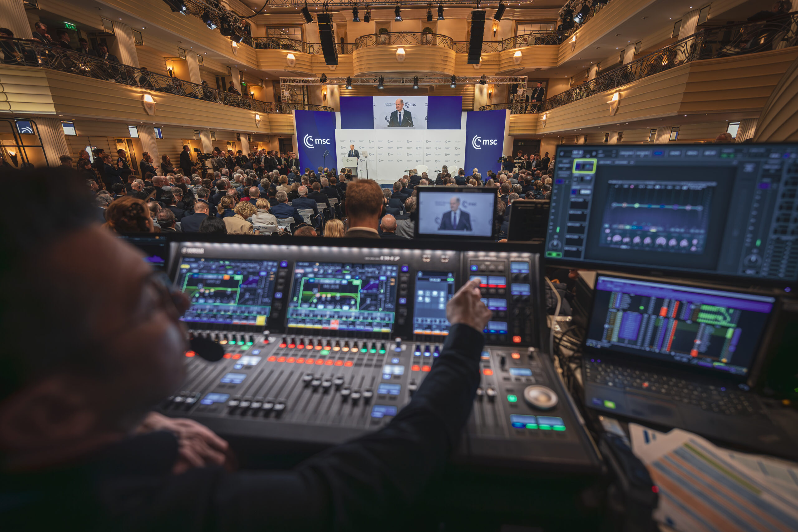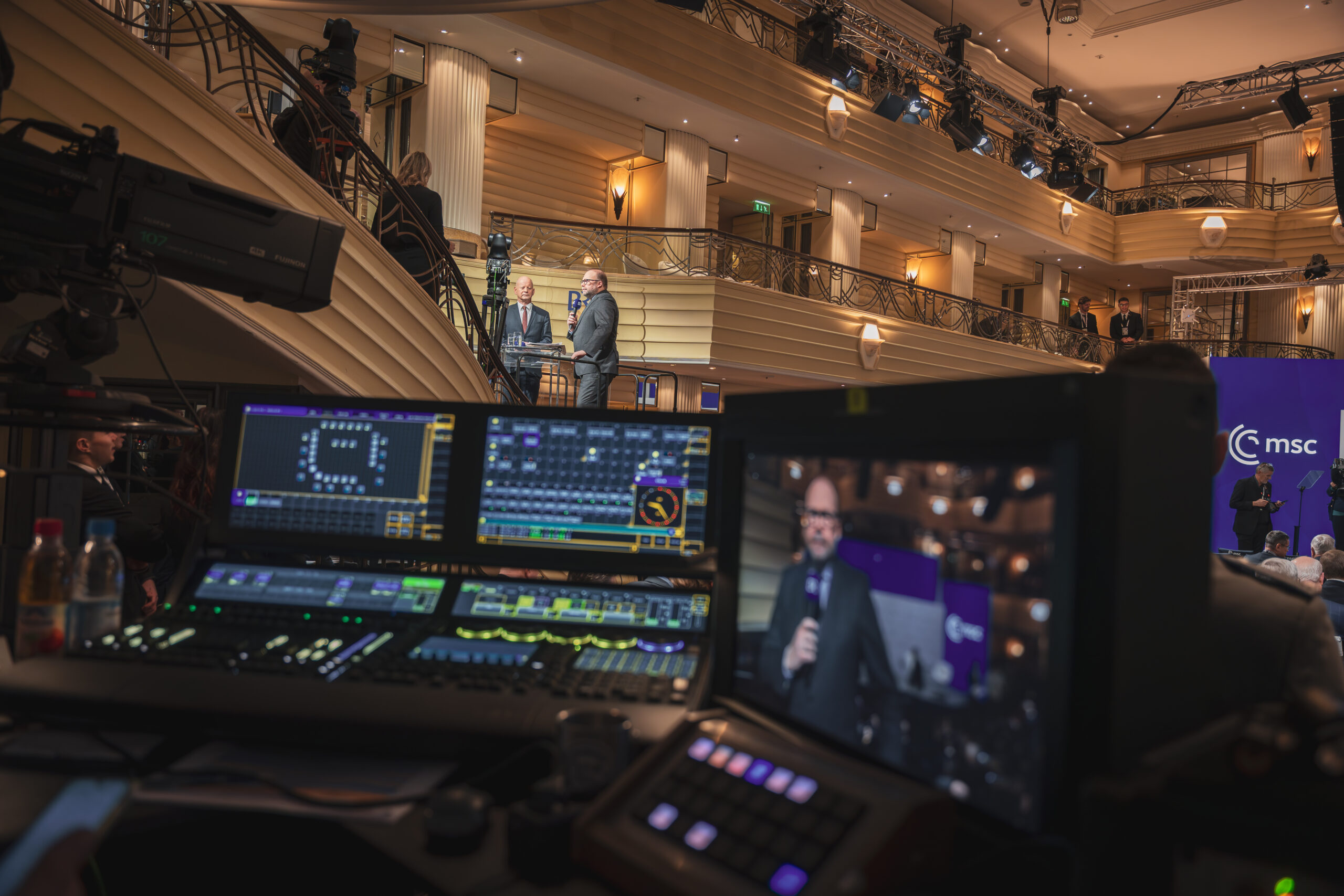 Die Rahmenbedingungen waren außergewöhnlich: ein Sicherheitsbereich mit strengsten Auflagen, keine Lagerkapazitäten im Bayerischen Hof, enge Zeitpläne und die Erwartung einer Null-Fehler-Toleranz. Parallel mussten Streams in alle Welt geroutet und gehostet werden, während kurzfristig zusätzliche Sideevents in externen Locations umgesetzt wurden.