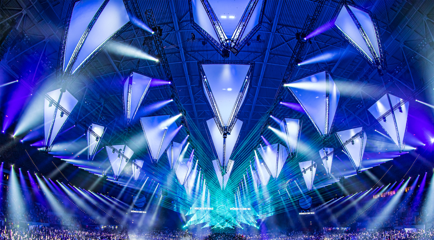 - die Winter Edition in der Merkur Spiel-Arena in Düsseldorf mit tonnenschweren Rigging-Strukturen, über 1.500 Lampen und mehr als 60 Lautsprechern,